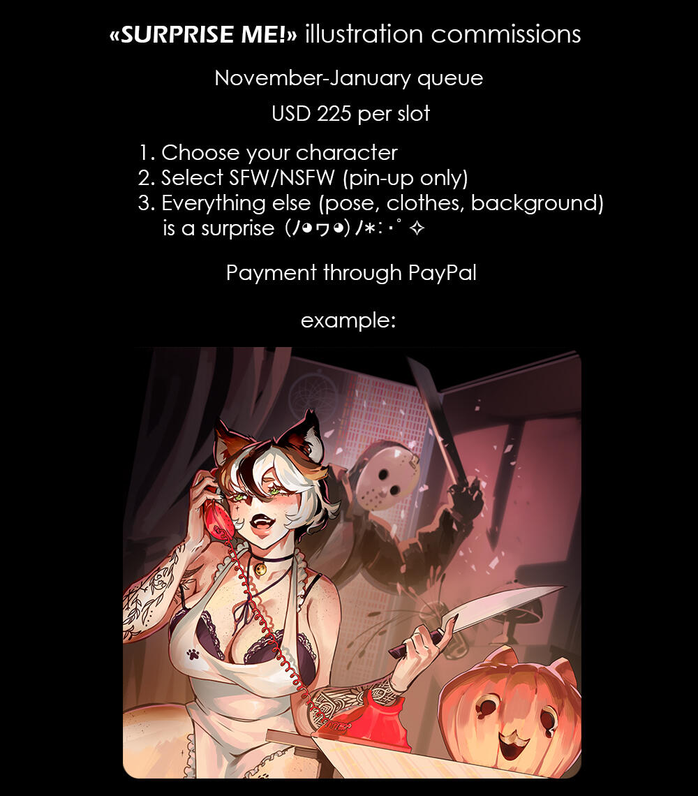 I accept private commissions (I won't publish finished work) but it will cost twice as much. You have to tell me beforehand if you want a private CM.